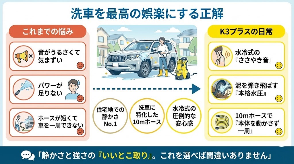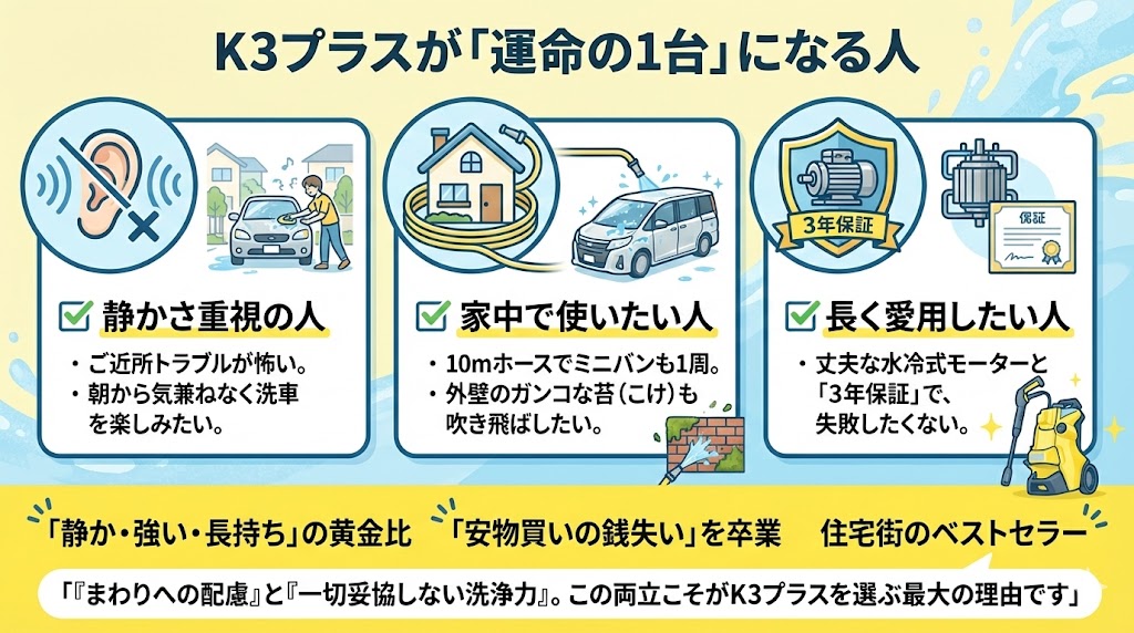 【結論】K3サイレントプラスは住宅街での洗車にぴったり!