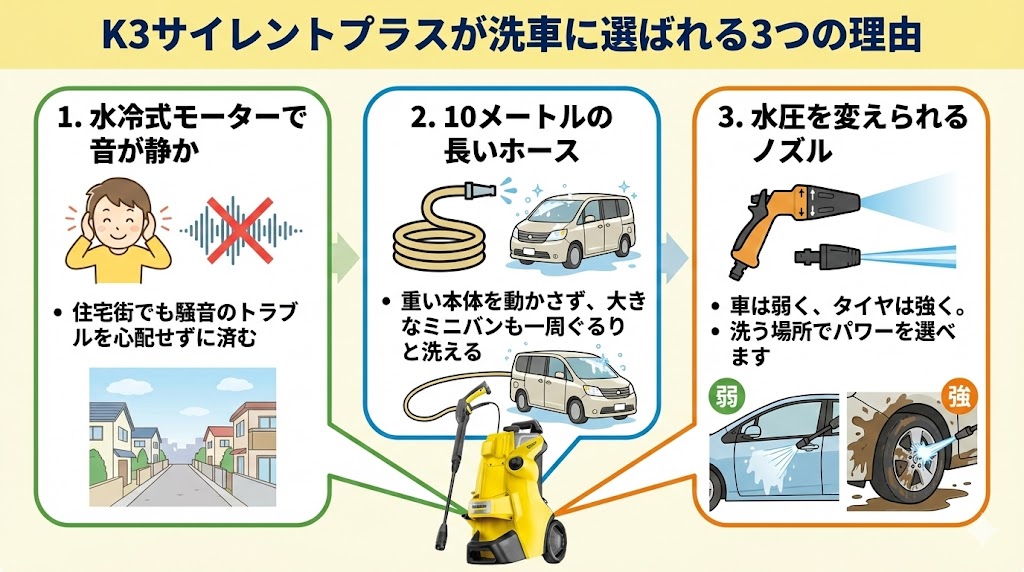 K3サイレントプラスが洗車に選ばれる3つの理由