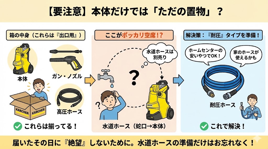 水道ホースが別売り(届いてすぐに使えない)