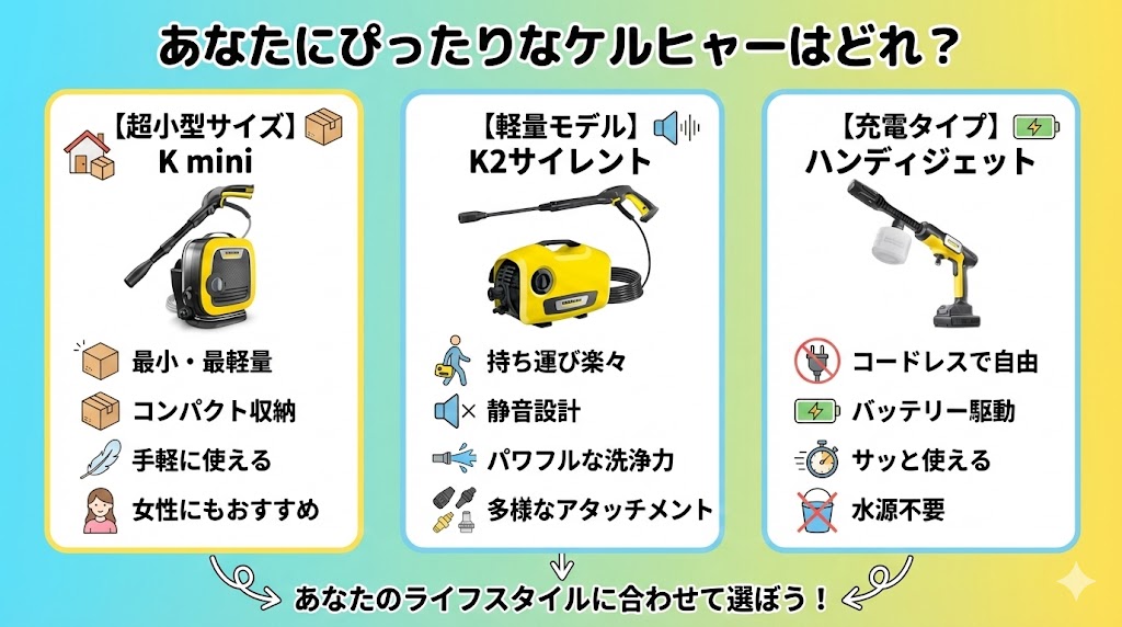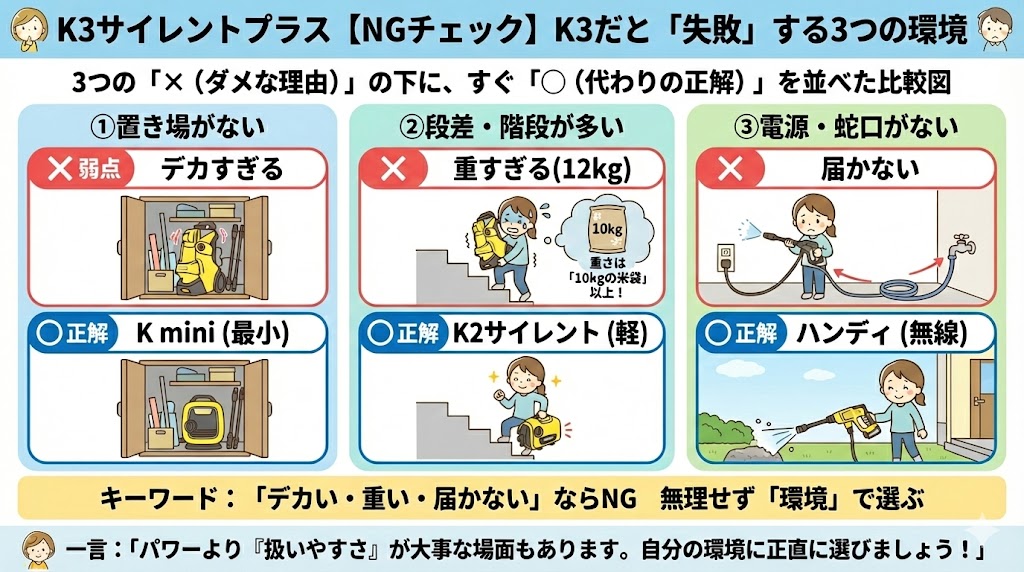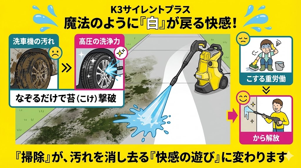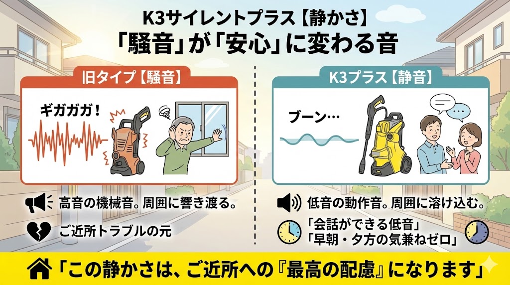 結論から言うと、住宅地で洗車をたのしむなら、K3サイレントプラスがもっとも正解に近い一台です。