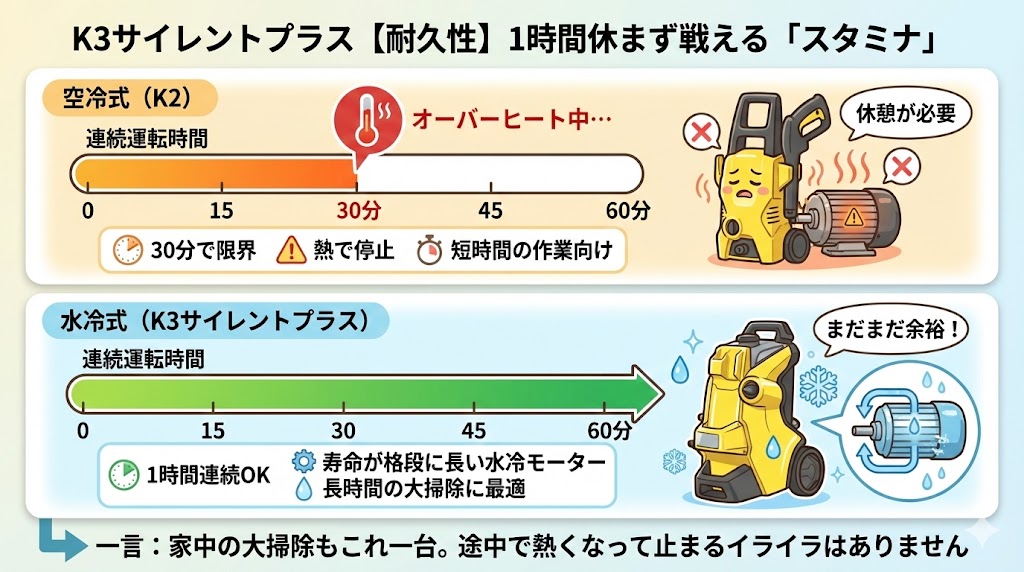 一度に30分以上洗うなら、無理をさせて壊す心配が少ないK3が安心です。