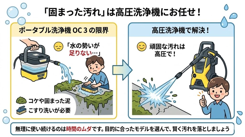 OC3は時間が経って固まった汚れを、水の力だけで吹き飛ばすパワーはありません。