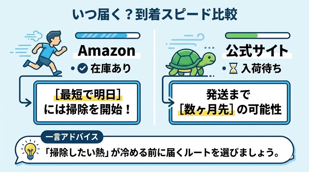 今すぐ掃除をしたい人にとって、公式サイトの納期は最大のリスクです。